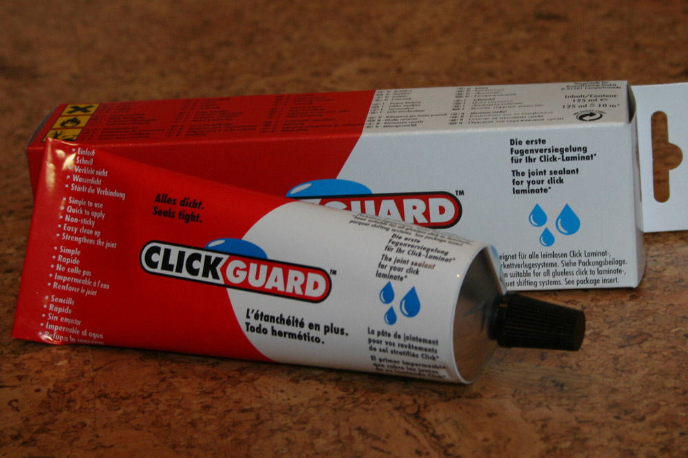 Отдельного внимания заслуживает герметик для ламината Click Guard. Это продукция немецкого производителя, которая считается самой надежной, от чего и самой популярной. Лабораторные изучения, которые были проведены разработчиками, доказали, что данный материал отличается очень высокими показателями влагостойкости. Именно они и способствуют продлению срока службы ламелей. Еще один плюс – бесцветность геля: он не оставляет никаких следов на досках в процессе монтажа.