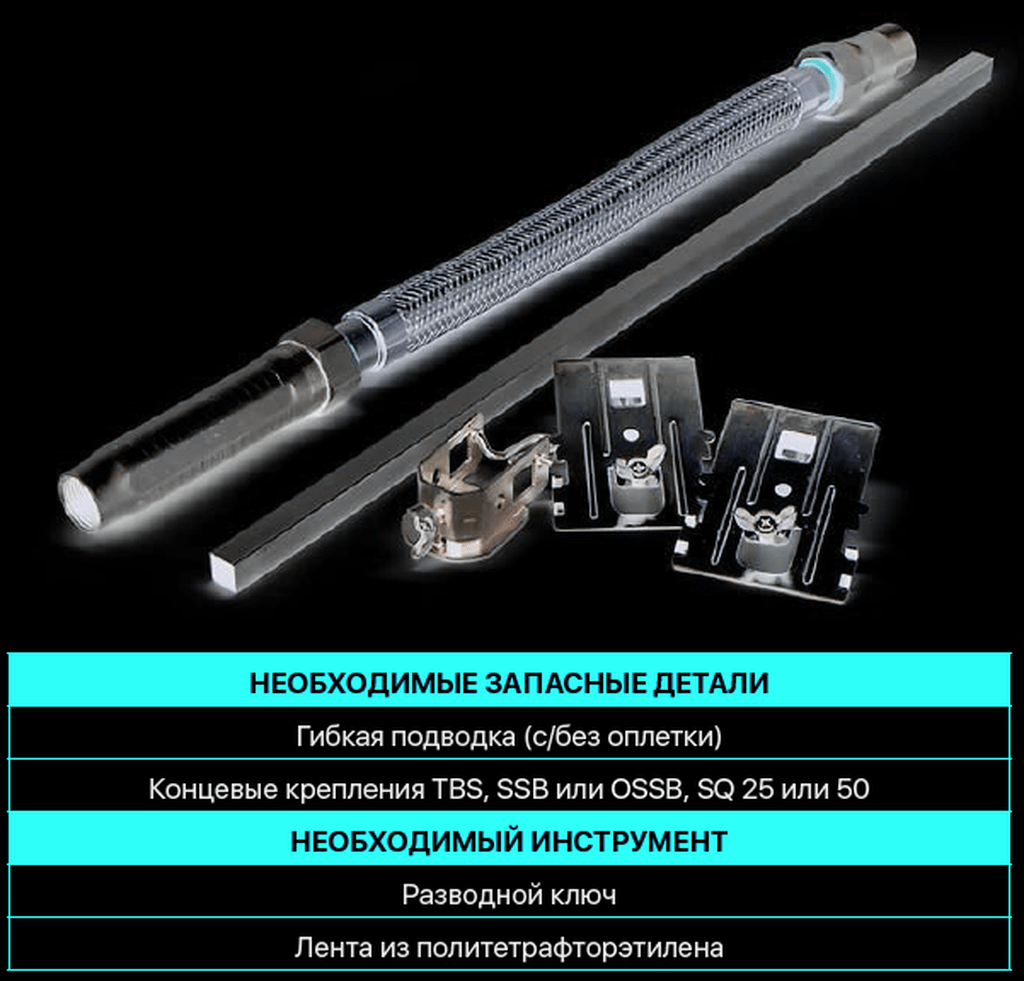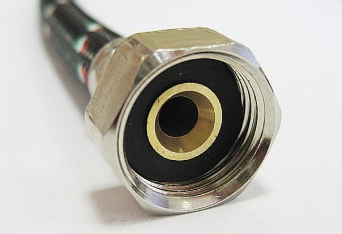 Подводка в разных системах соединяется через монтажные элементы на концах шланга – накидные гайки и штуцеры. Модель шланга выбирается по его длине, типу подключения и размеру монтажного узла. Фитинги выпускаются с размерами от 0,5″ до 1,5″. Шланг крепится свободно, без натяжения. В противном случае происходит деформация запрессованных соединительных штуцеров.