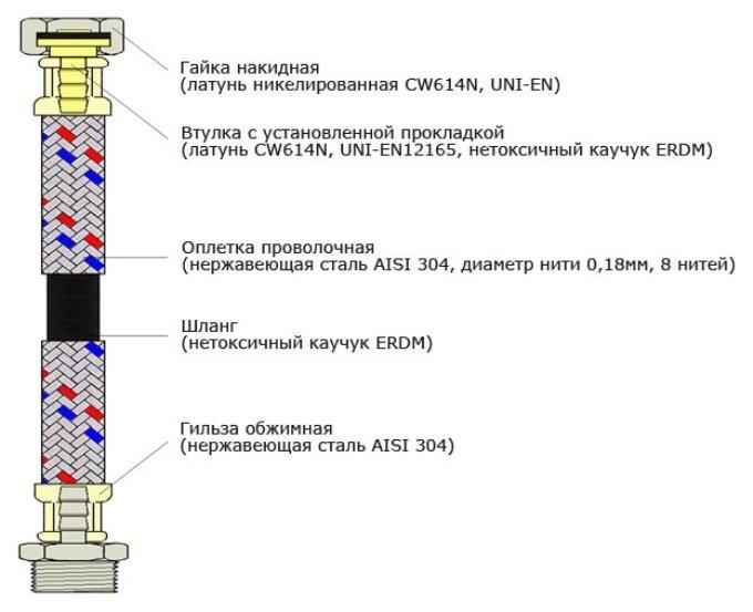Многие производители используют шланг из нетоксичной резины во время производства качественных гибких оплеток, что делает их абсолютно безопасными для здоровья. В некачественных подводках используется техническая резина, имеющая своеобразный запах. Оплетка резинового шланга может быть выполнена из оцинкованной стали, алюминия, нержавеющей стали или из нейлона. Как правило, подводки, покрыты алюминиевой оплеткой, выходят из строя намного раньше своих собратьев – в среднем после 36 месяцев эксплуатации. Этот вид подводок рассчитан на рабочее давление примерно до 5 атмосфер. В случае с оплетками, выполненными из оцинкованной стали, ситуация обстоит намного хуже. Если первая сможет прослужить до 3 лет, то из оцинковки, выйдет из строя уже через несколько недель эксплуатации.