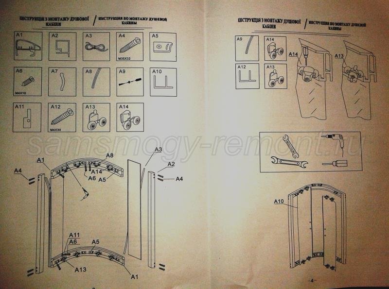 Вся работа выполняется на высушенной поверхности. Сборка душевой кабины должна проводиться по инструкции: