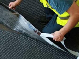 - Уложить полосы внахлёст на 100 мм и с заходом на стены примерно в 150 мм.