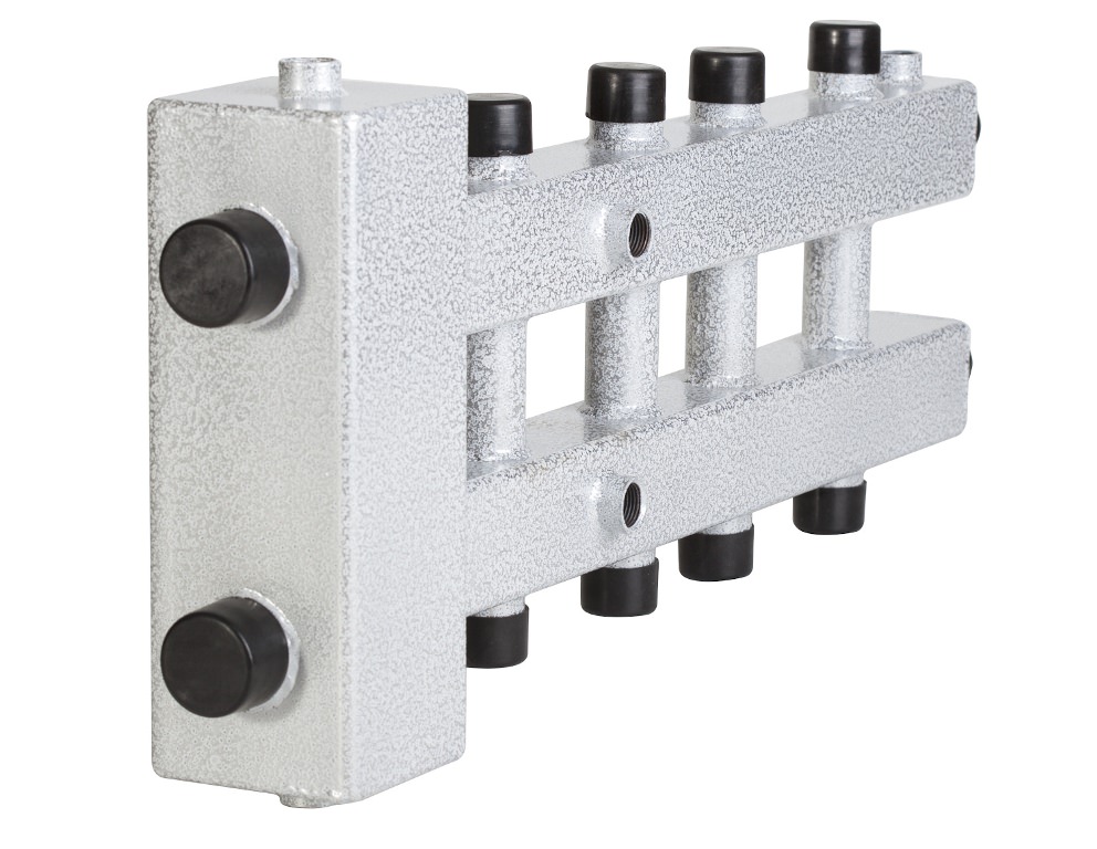 Распределительный коллектор монтируют после гидрострелки. Устройство состоит из двух независимых частей, которые объединяют перемычки. По количеству вторичных контуров врезают попарно расположенные патрубки.