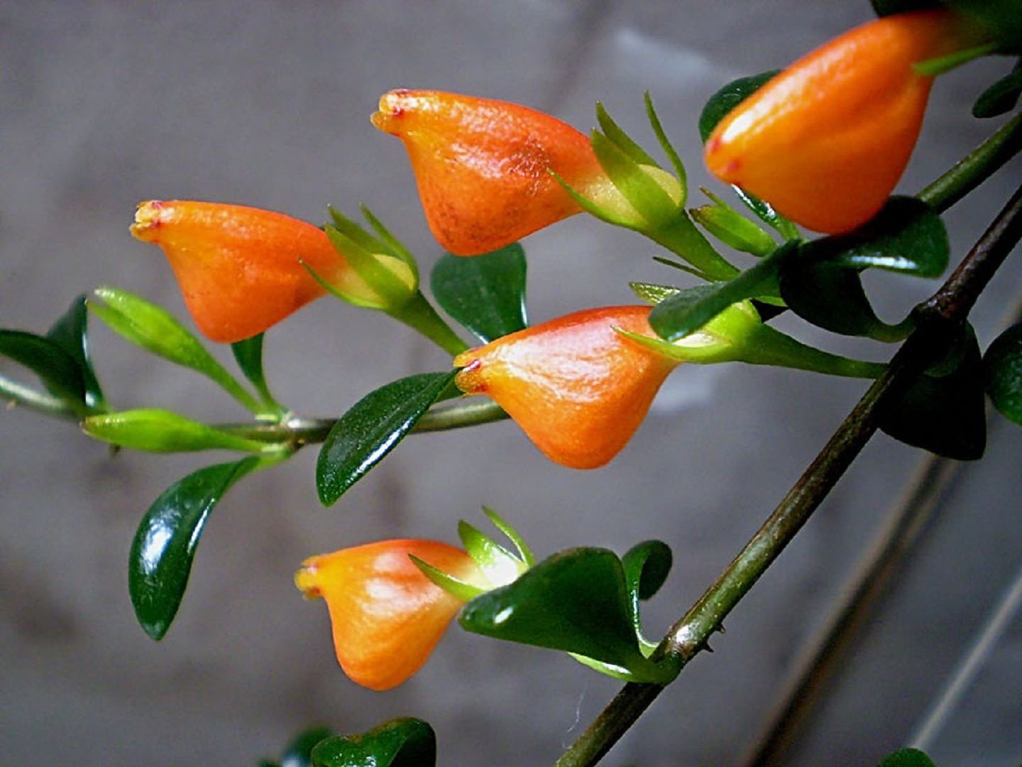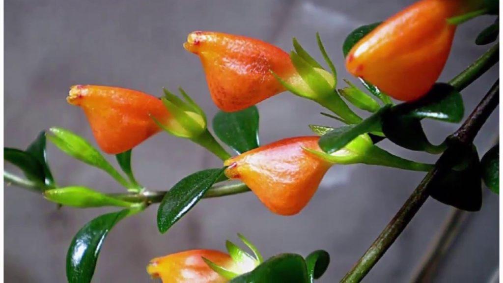 – является вечнозеленым эпифитным полуампельным растением. Эту красавицу можно узнать по: сочным, гладким, глянцевым, эллиптической формы листьям насыщенного зеленого оттенка длиной до 4-х см; маловетвящимся побегам; цветкам с венчиками, образованными сросшимися оранжевыми лепестками и характерным вздутием в нижней части. Листва культуры после ее цветения остается на месте.