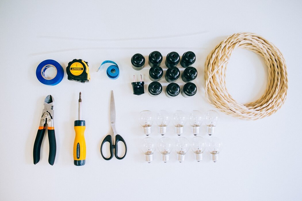 К Вашему вниманию первый и самый интересный мастер-класс, который наглядно показывает, как сделать электрическую гирлянду с лампами на 220 В. Итак, для начала подготавливаем следующие инструменты и материалы (все, что показано на фото):
