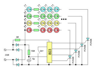 Пройдя через тиристоры, выходное электропитание направляется на световые диоды в гирлянде. Количество выходов непосредственно влияет на разнообразие цветов, выдаваемых осветительным устройством. Если имеется только пара выходов, то реализуется наиболее простая схема, при которой одна половина лампочек затухает, а другая — загорается.