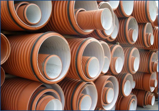 - Гофрированные трубы из поливинилхлорида (ПВХ), используются в системах производственных канализаций, центрального водостока, для канализаций загородных домов. Выдерживают сильные механические нагрузки, не засоряются в процессе эксплуатации, имеют рабочую температуру от -40 до + 50 градусов Цельсия, при небольшом интервале времени до +90. Канализационные двухслойные трубы из ПВХ не подвергаются коррозии, экологически безопасны, монтируются на глубину до 15 метров, имеют срок годности до 50 лет. Цвет гофрированных труб для наружной канализации бывает оранжевым, серым и желтым.