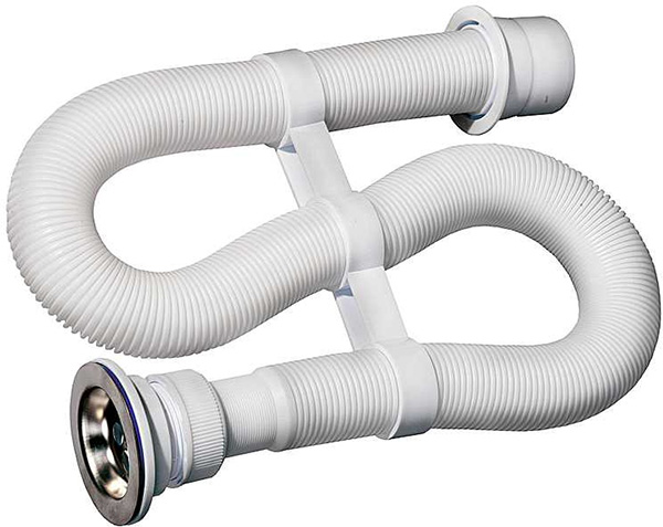 Гофрированный сифон является разновидностью изогнутой трубы. Разница в том, что часть с изгибом выполнена не в форме сплошной трубы, а в виде подвижного гофрированного шланга. Именно гофра обеспечивает его подвижность и возможность упрощённого монтажа к сливной трубе. Данные конструкции изготавливают из пластика. Изогнутое положение гофры поддерживается хомутиком. При необходимости соединительный хомут можно сдвинуть, сделать место изгиба более выраженным или менее изогнутым.