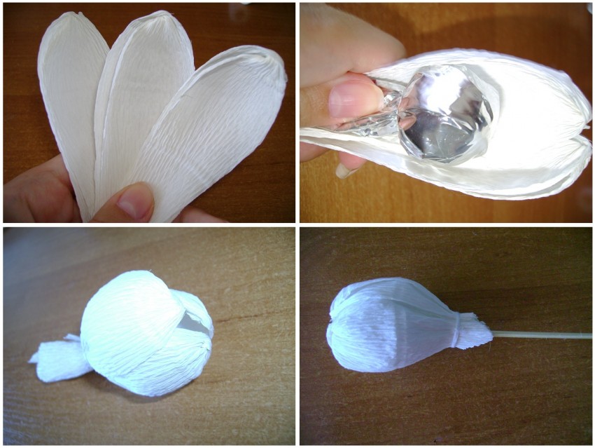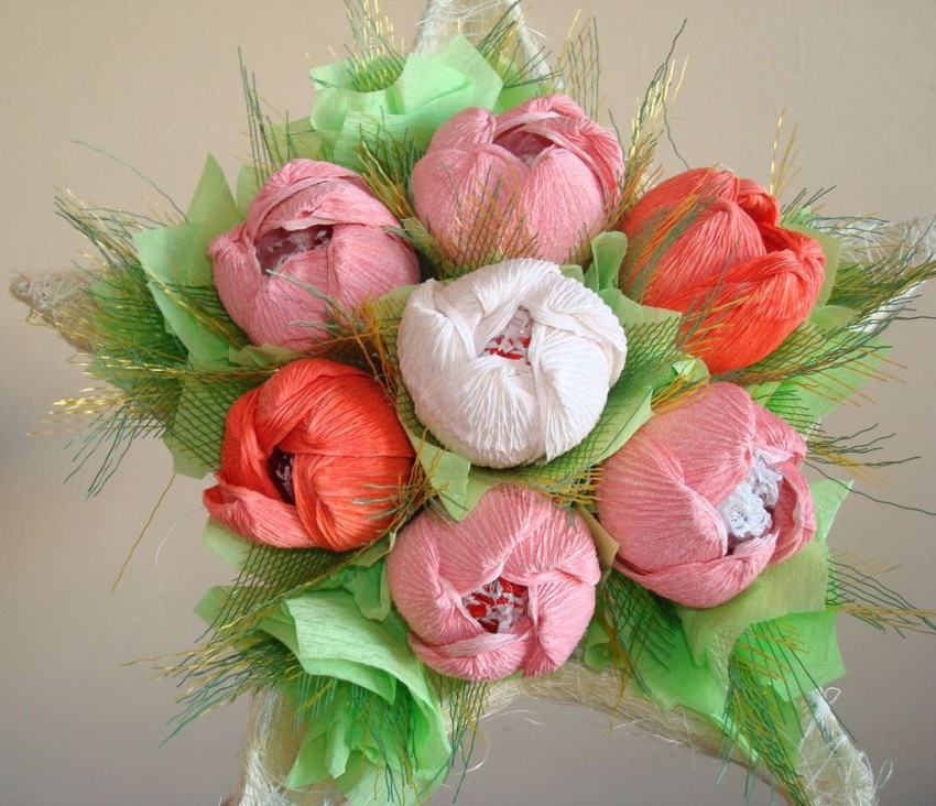 Конфеты закрепляются на шпажки или зубочистки, украшаются с помощью вырезанных из гофрированной бумаги лепестков, листьев, тычинок.