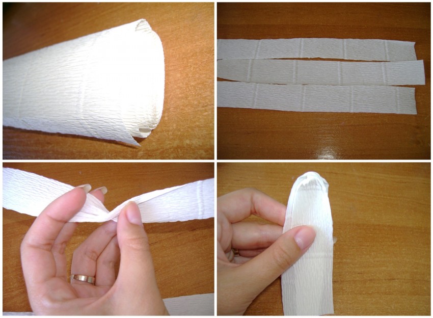 Из двух полос зеленой бумаги вырезаем лепестки и немного растягиваем их для придания нужной формы.
