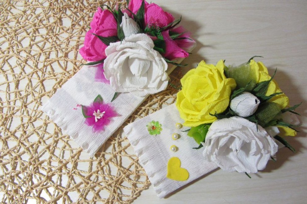 Несмотря на различные технологии, принцип изготовления бумажных цветов с конфетными элементами один.