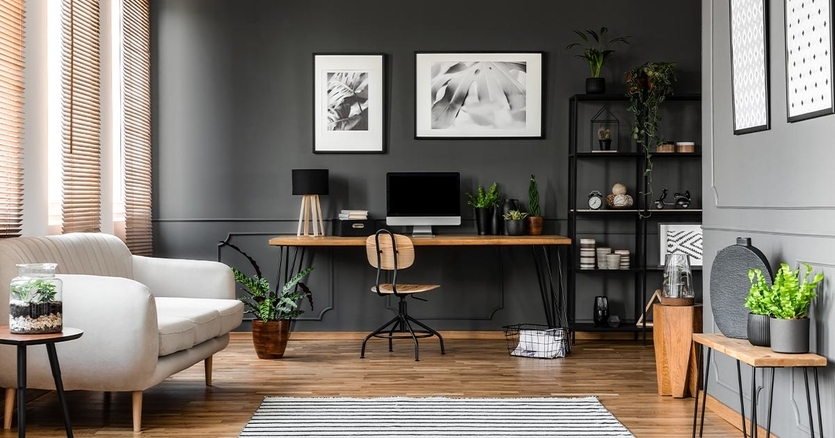 Для пола подойдёт деревянный паркет тёмного цвета (или ламинат под натуральное дерево). Главное правило – максимально тёмный оттенок напольного покрытия, чтобы создать контраст с мебелью, потолком и стенами. Керамическая плитка, имитирующая натуральный камень, также будет пригодной для некоторых помещений в доме.