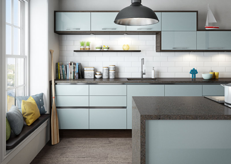 Минималистичный кухонный гарнитур голубого цвета