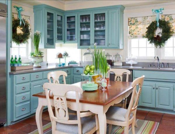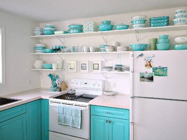 Самое интересное, что аквамарин прекрасно микшируется со многими вариантами светло-зеленого и салатового. Их сочетание оживляет кухонное пространство, делает его особенно уютным.