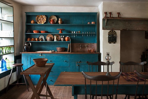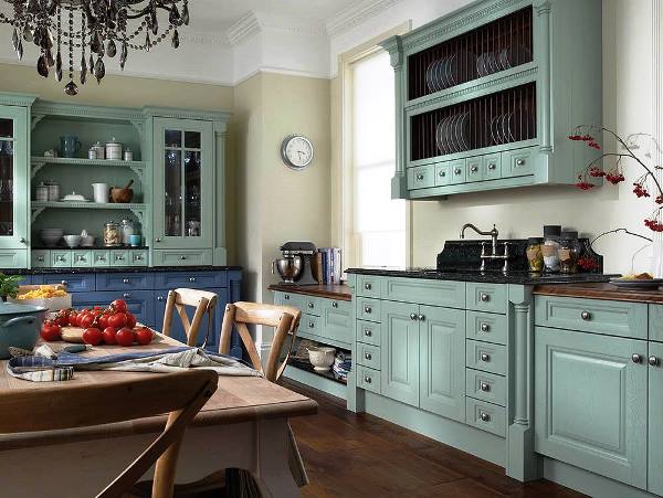 Атмосфера в такой кухне дышит уютом и теплом домашнего очага. Синяя мебель хорошо сочетается с натуральным деревом. Дополняющими элементами могут служить тканые коврики, вышитые вручную скатерти, расписная керамика.