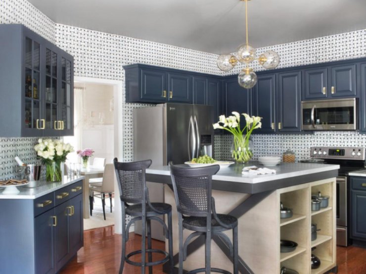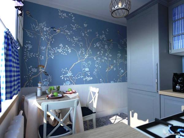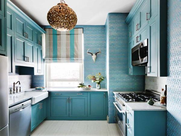 К тому же отделка кухни необязательно должна быть однотонной. Вы можете приобрести красивые голубые обои с ненавязчивыми узорами. Подберите правильный рисунок для того, чтобы визуально скорректировать помещение и придать ему определённые стилистические черты.