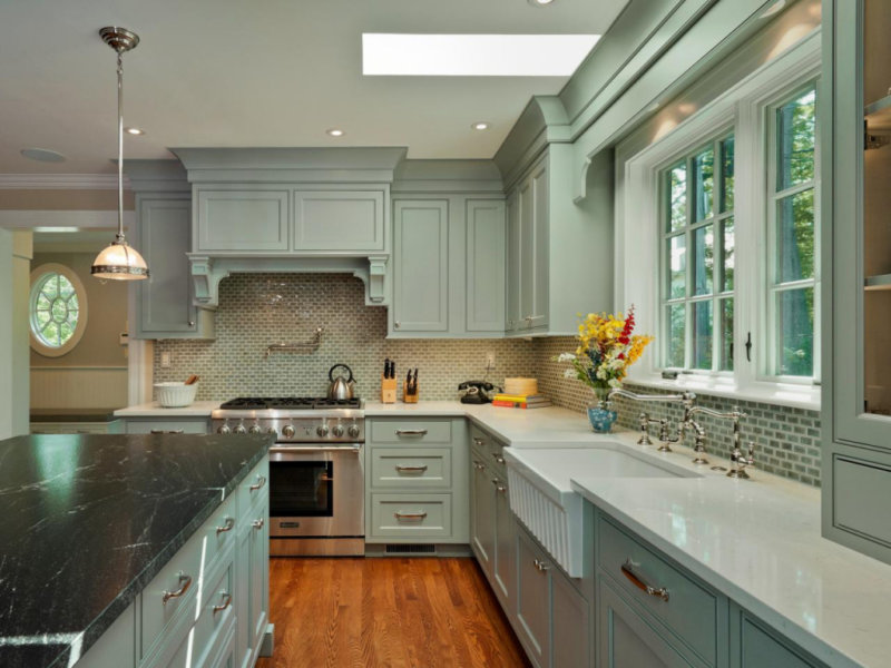 Если же вы будете формировать акценты на мебели, поверхности следует перекрасить в светло-голубой или насыщенный оттенок. Фасады можно оформить декоративной резьбой или вставками из стекла. Столешницы такого гарнитура могут быть выполнены в другом цвете или из другого материала.