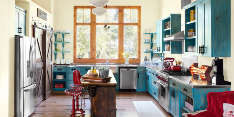 Как украсить дизайн интерьера кухни голубого цвета?