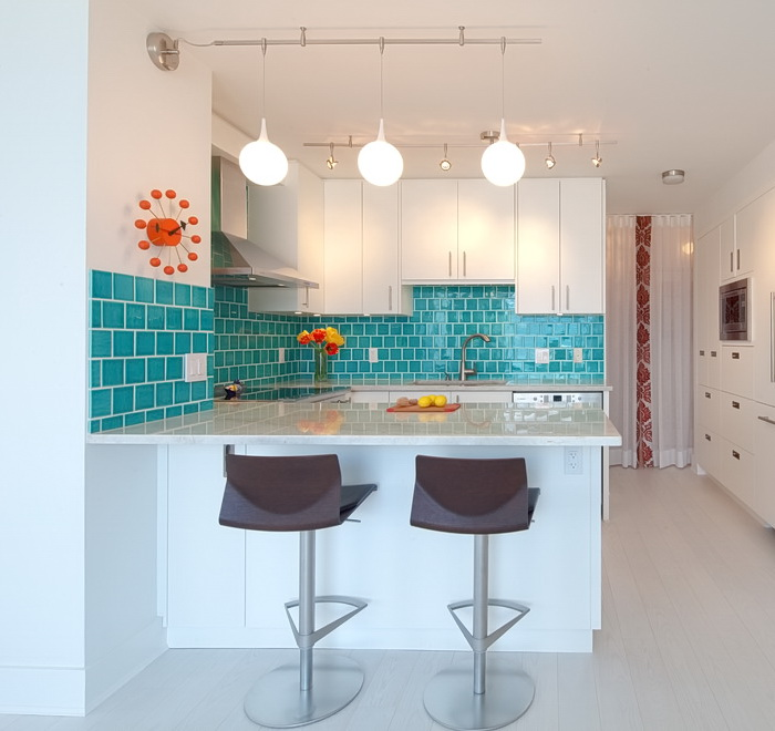 Ну а если планировка кухни предполагает полное освобождение одной из стен – это отличный повод добавить цветовое разнообразие в декор!