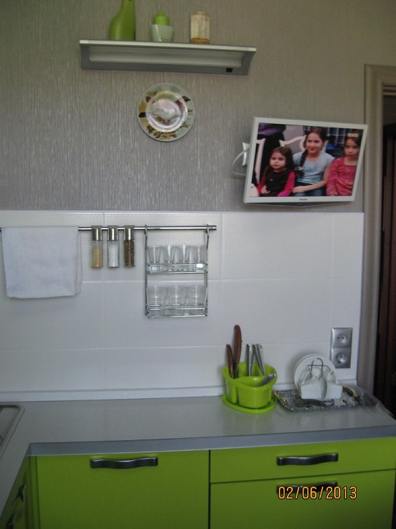 Глянцевая салатовая кухня, серебристо-серый фартук, белая столешница — идеально подходящие друг другу оттенки