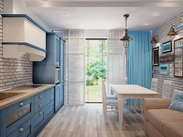 Морские оттенки могут присутствовать не только в расцветке фасада, но в виде текстиля – в них может быть выдержана скатерть, занавески, обивка мягкой мебели, прихватки и полотенца.
