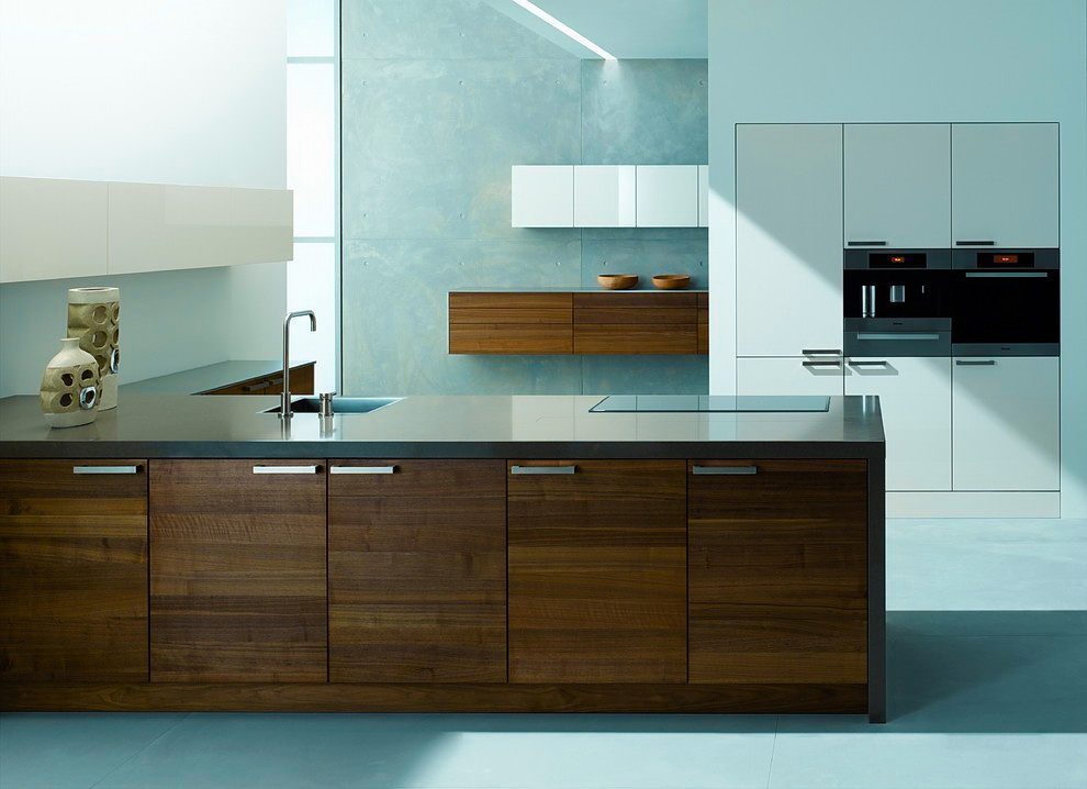 В современных кухнях вы можете поэкспериментировать с материалами. Пластиковая кухонная мебель в голубом цвете будет смотреться не менее великолепно. На фоне природного оттенка будут эффектно блестеть ручки, а также прочая фурнитура из хромированной стали.