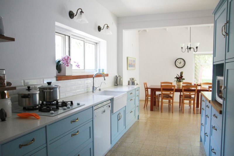 Если вы уже подобрали для кухни голубой гарнитур, выберите для пола и стен материалы другой палитры. В этом случае наиболее предпочтительным будет сочетание светлых стен и деревянного пола.