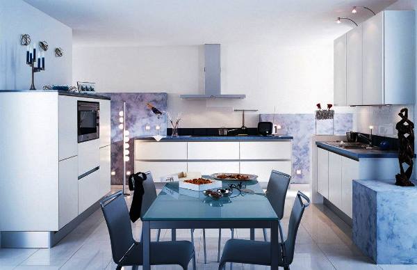 Дизайнеры предостерегают от белых кухонных гарнитуров на голубоватом фоне стен и светлом полу. Неудача в этом случае из-за того, что получается большая перегрузка светлого, а мебель, визуально легкая, почти воздушная, начинает утяжелять все помещение.