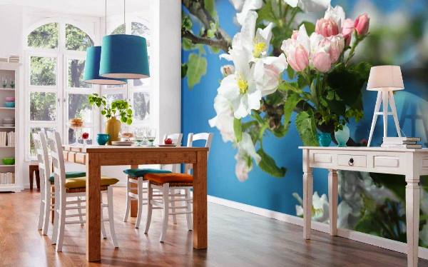 Поклейте на стене фотообои с изображениями на тематику природы – и кухня станет еще очаровательнее.