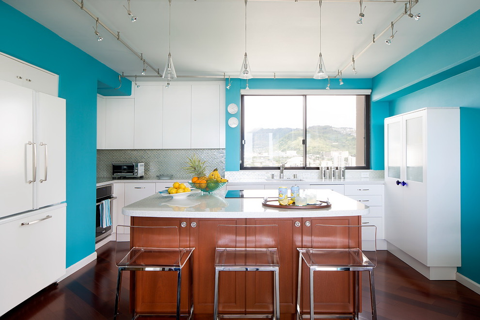 Современный тренд: голубой кухонный гарнитур без навесных шкафов