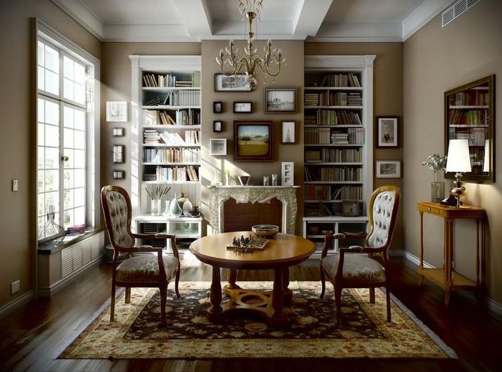 Стандартно оливковый цвет становится приоритетным выбором для классических гостиных. Здесь вы не встретите яркой отделки и цветовых контрастов, потому что основной тон не разбавляется кричащими оттенками, а остается в приглушенной гамме, отлично передающей чопорную невозмутимость элегантного классицизма. Конечно, обои оливкового цвета в таком интерьере не должны быть гладкими и безликими, они вполне могут иметь легкую объёмную структуру или быть покрытыми нежным, утонченным орнаментом молочного цвета, но в остальном ничто не должно отвлекать от эстетичности их восприятия.