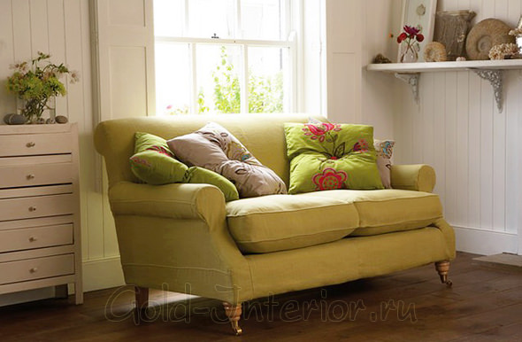 Фисташковый оттенок обычно довольно плотный и вязкий, но встречаются и исключения. Бледный фисташковый, почти оливковый диван в интерьере можно увидеть на фотографии ниже. Такой редкий цвет не стоит заслонять тяжелыми оттенками – выбираем для оформления комнаты полупрозрачную и легкую мебель, делая ставку на воздух и свет.