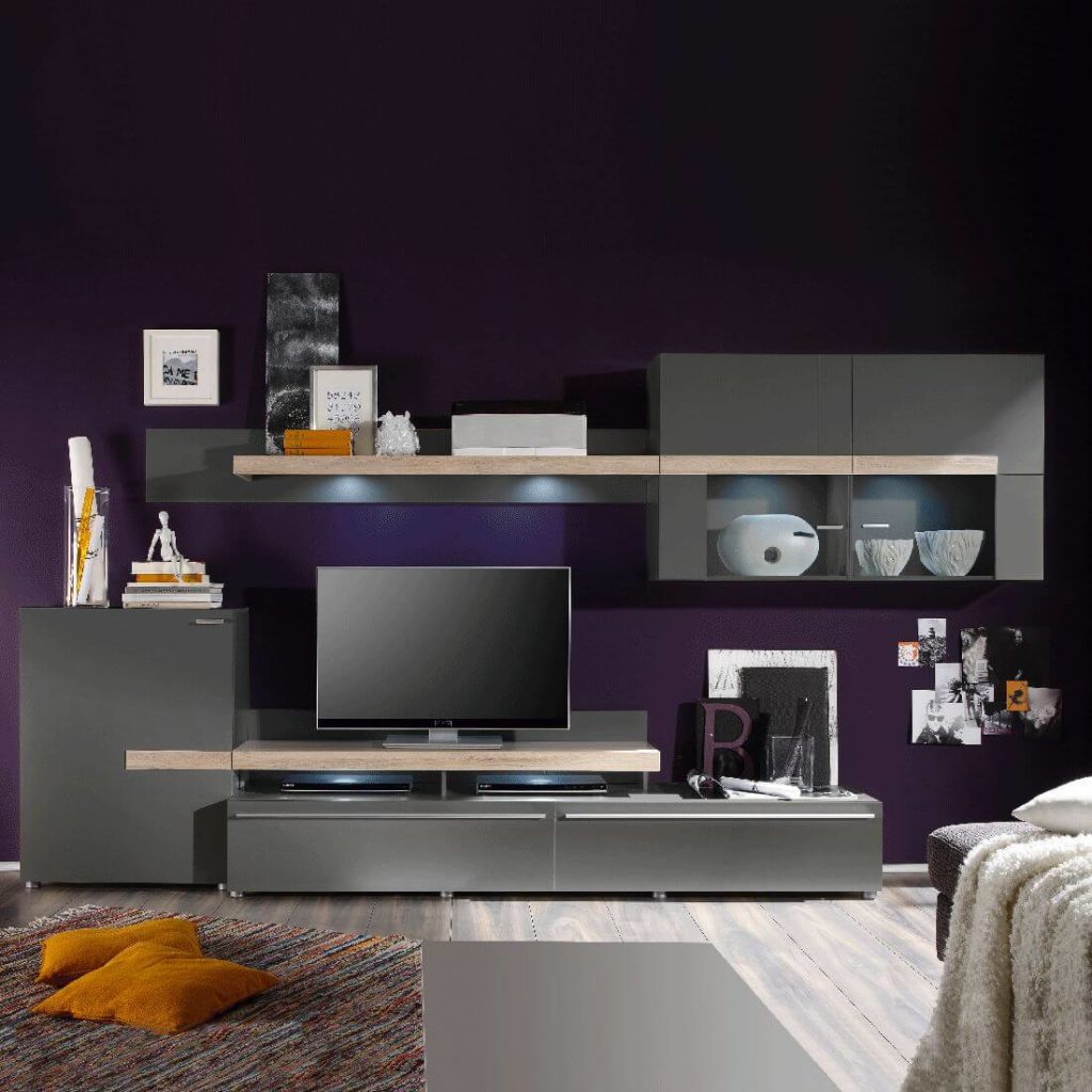 - Минималистический вариант представляет собой модную полку-шкаф, занимающую всю нижнюю часть конструкции. В зависимости от стилистического решения, в ней от 4 до 8 выдвижных секций. Сверху помещается телевизор, рядом с которым остается свободное пространство. Венчает всю композицию рядом шкафчиков, закрепленных на уровне потолка.