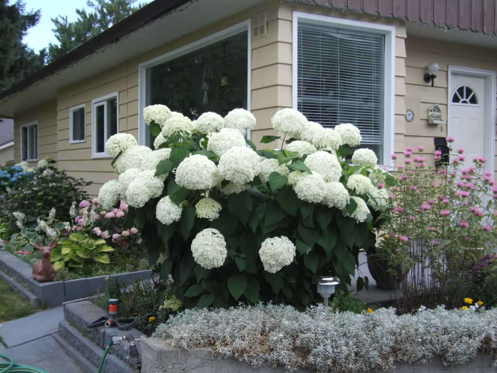 Возле крыльца, входа, в других репрезентативных местах правильное впечатление произведут кусты с большими соцветиями, заполненными плодущими цветами:
