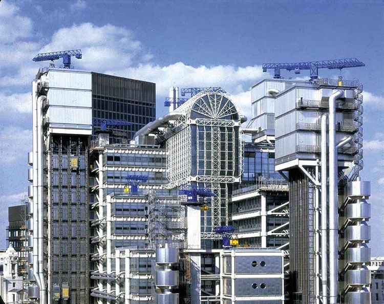 Индустриальное ответвление hi-tech построено на применении элементов промышленного назначения: труб, кронштейнов, арматуры, стекла, металла и всего, что связано с производственной тематикой. Основой здания является железобетонный или металлический каркас, а все коммуникации, лифты, лестницы и т.п. выносятся на всеобщее обозрение.