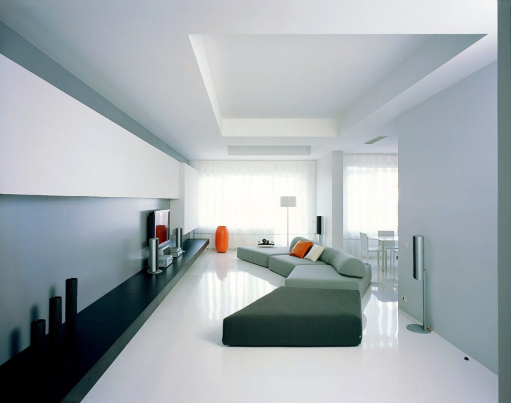 Стремясь к легкости и простоте, хай тек отдает предпочтения прозрачности и насыщенным холодным оттенкам. Белый цвет в гостиной должен идти как основной с добавлением металлического и черного.