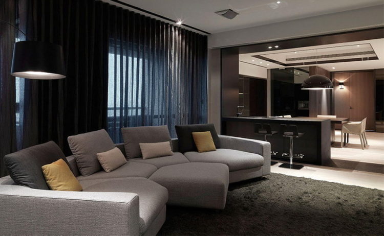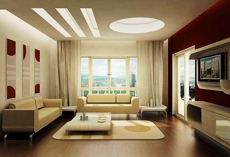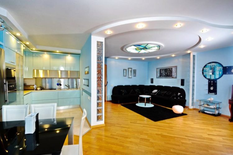 Популярной тенденцией современной классики является совмещение дизайна гостиной с кухней или столовой. Эти зоны выделяют с помощью освещения, потолочного и напольного оформления. Гостиная приобретает дополнительное пространство и светлый образ.