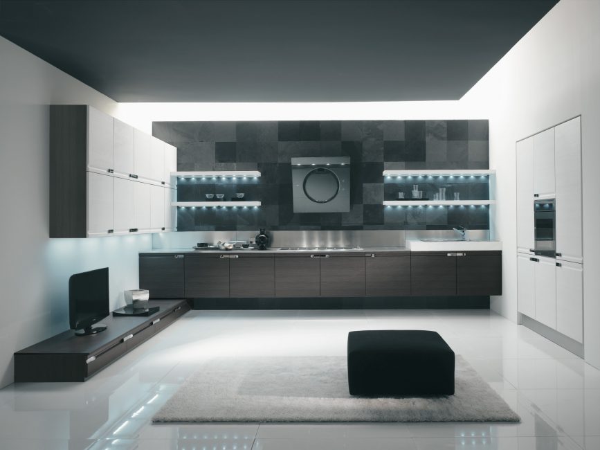 На потолке лучше использовать точечное освещение, а в проемы, полки и мебель включать скрытую подсветку с использованием светодиодных шнуров. Подобный эффект увеличивает блеск стекла и глянцевых поверхностей, создавая ощущение легкости.