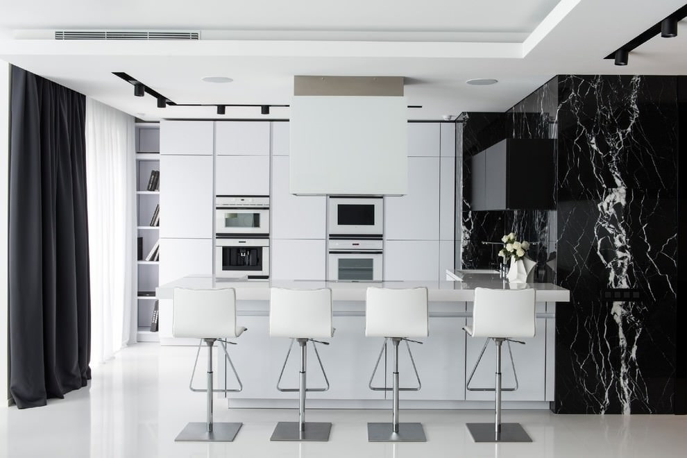 Барная стойка была бы идеальна в небольшой хай-тек кухне, а также компактный стеклянный или выдвижной стол, который может регулироваться в зависимости от того, нужно ли ему разместить 6 человек или 2. Стулья могут быть сделаны из: