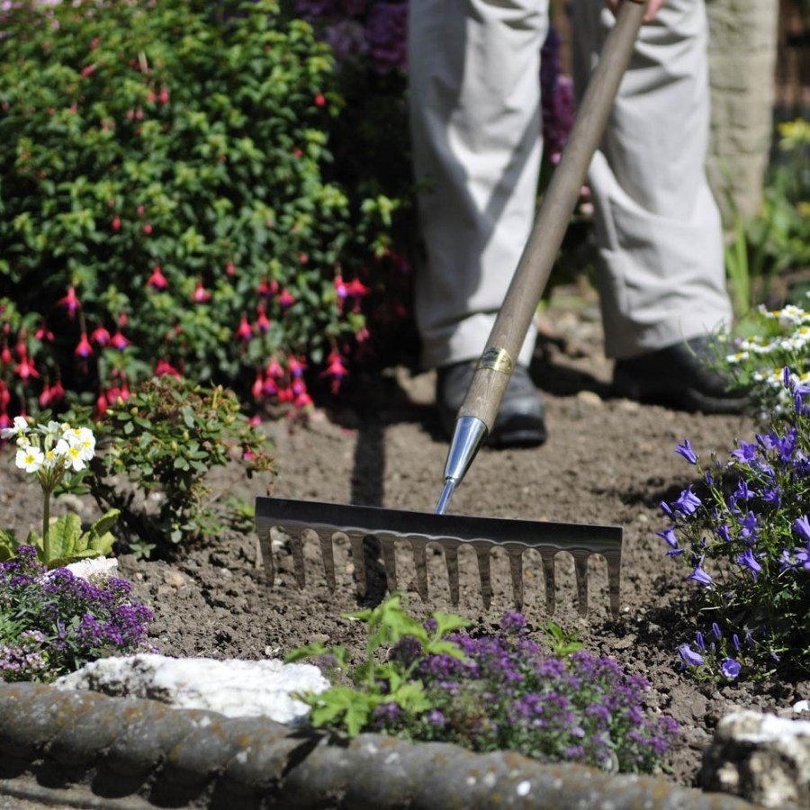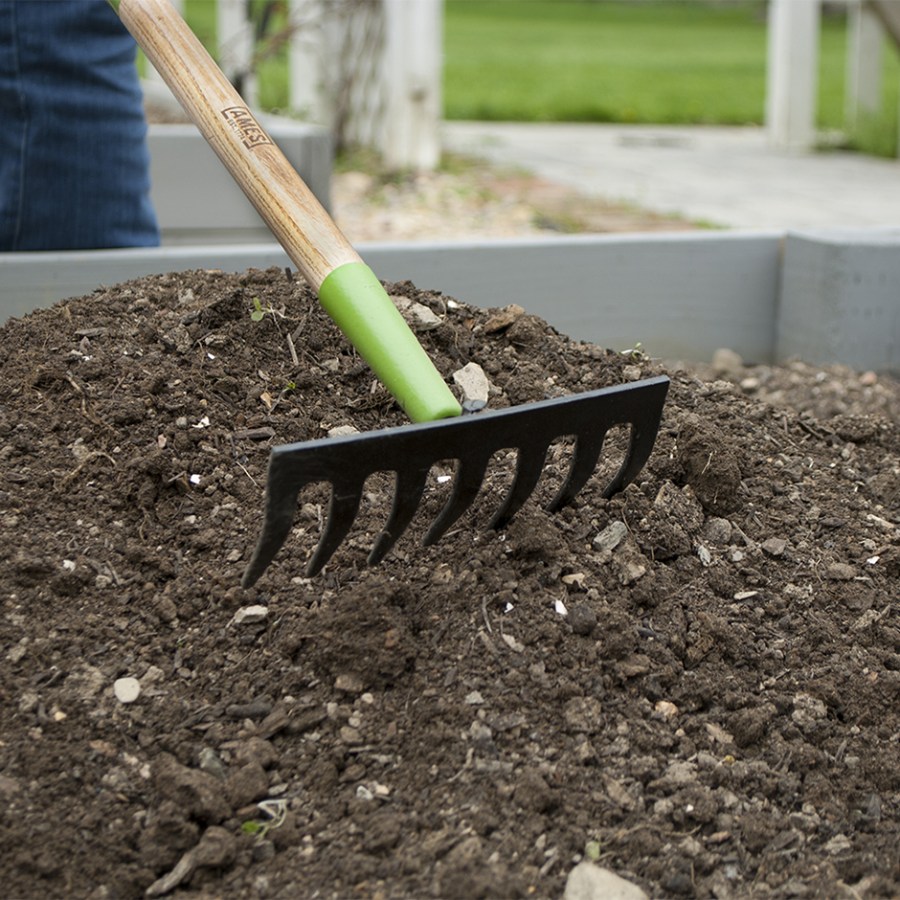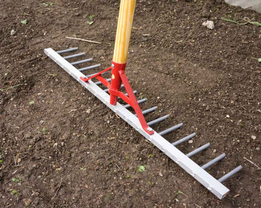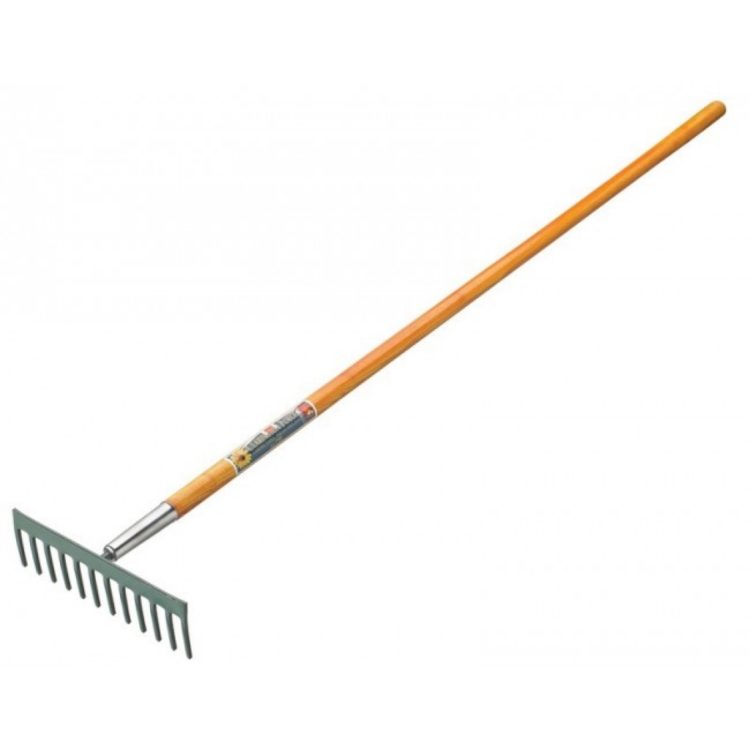 Прямые садовые грабли с деревянным черенком отлично подходят для разбивания комьев после того, как почва уже перекопана. Они выглядят в виде буквы «Т», а зубья у них имеют небольшой загиб внутрь.