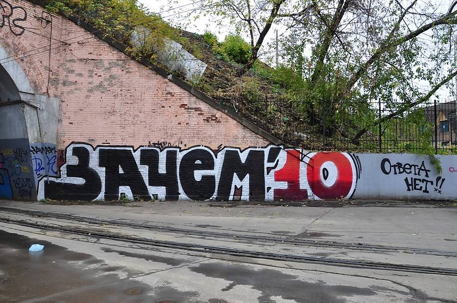 Понять, что значит надпись «Зачем» не так уж и сложно. Нужно взять баллончик с краской и выразить своё индивидуальное видение этой почти философской проблемы. Ничего это всё не означает, но на виду у прохожих и сотрудников правоохранительных органов скучно не будет.