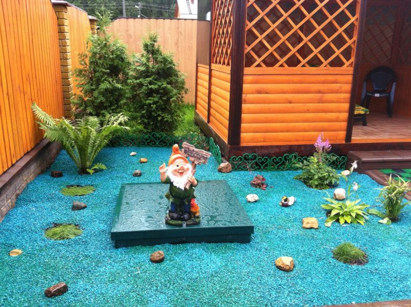 В первую очередь разноцветный камень используют в декоре слишком тенистых участков, где не растет практически ничего культурного, кроме травы. На тенистом участке можно разбить сухой ручеек, с аккуратным небольшим мостиком через него. В заболоченном месте прекрасно выглядит пруд, берег которого усыпан разноцветным щебнем. А аккуратно выложенная композиция из валунов придаст водоему природный вид. Очаровательно будет выглядеть дно декоративного водоема, выложенное окрашенным щебнем, например, в зеленый, синий или голубой цвет.
