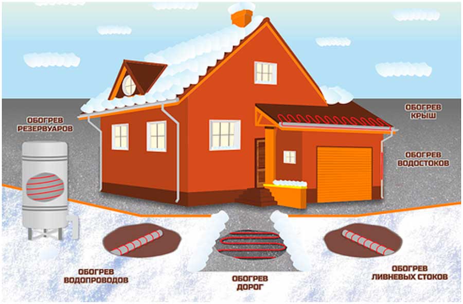 Сфера применения нагревательных кабелей для труб (и не только) достаточно велика. Их монтируют в местах, где необходим регулируемый подогрев примыкающих (окружающих) поверхностей или материалов.
