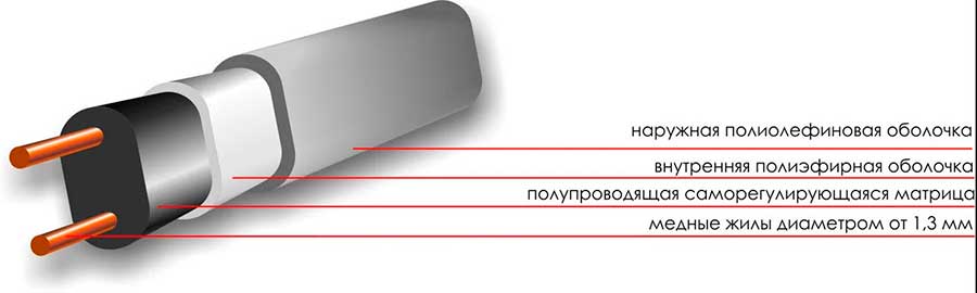 Особенность этого варианта – наличие саморегулирующей матрицы в структуре изделия, которая изготовлена из полупроводникового эластичного материала и находится между токоведущими жилами. Уровень сопротивления матрицы определяется температурой окружающей среды, что обуславливает объем расходуемой мощности и КПД нагревания. Тепло провод выделяет только там, где это необходимо: если какой-то участок лежит во льду, а второй – в тепле, то сильнее нагреваться будет именно первый.
