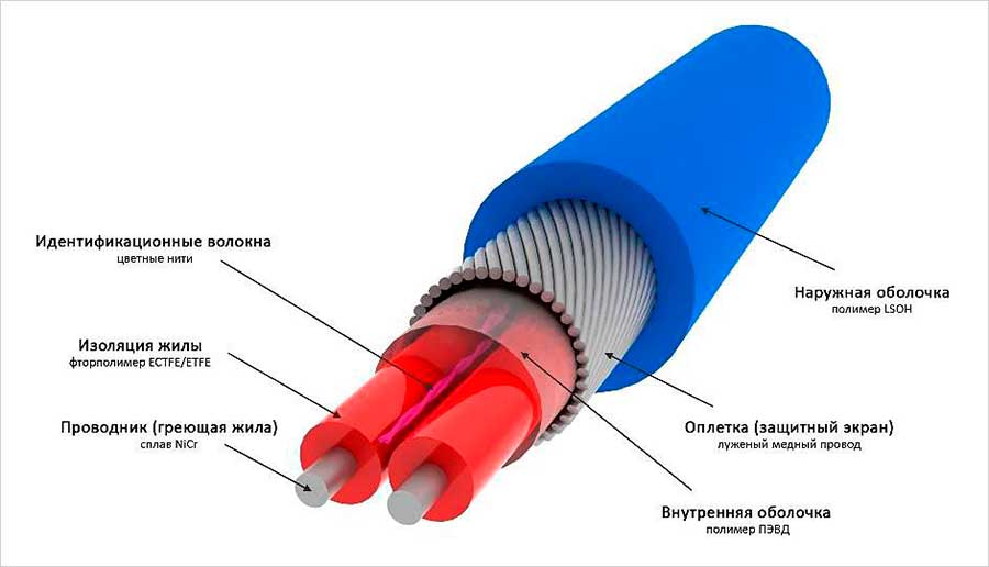 Главными составляющим частями греющего кабеля являются следующие элементы: