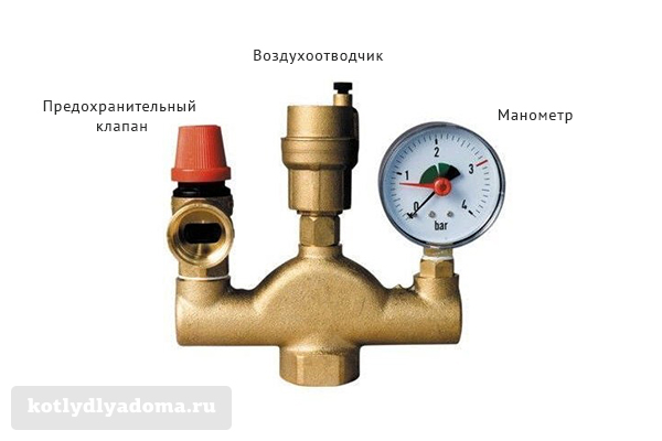 Группа безопасности для системы отопления состоит из корпуса, на котором установлены три прибора: манометр, предохранительный клапан и автоматический воздухоотводчик: