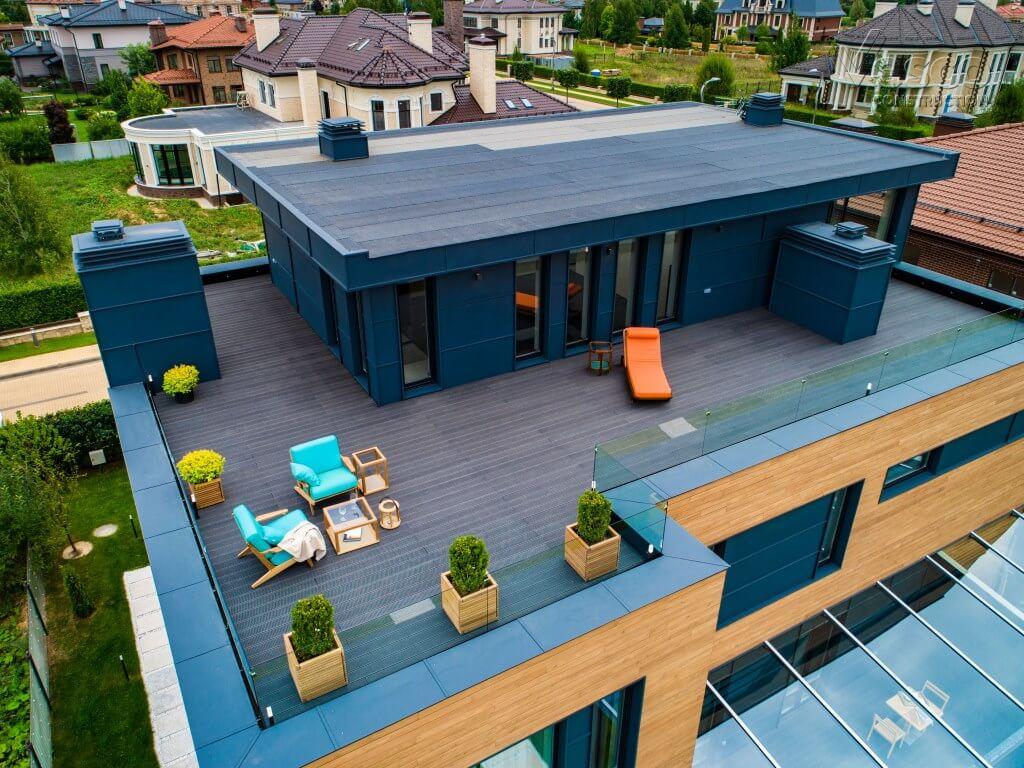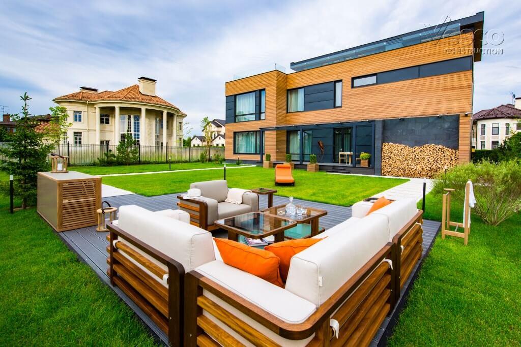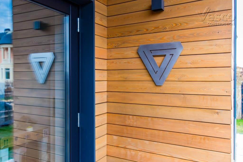 Основание дома представляет собой прочный и надежный ленточный фундамент из железобетонных блоков, стены выложены из высококачественного кирпича. Межэтажные перекрытия выполнены из монолитных железобетонных плит. Дом соответствует актуальной эко-стилистике и это его определяющая характеристика. Его экологичность проявляется не только в использовании натуральных природных строительных материалов – дом концептуально воплощает все стандарты этой жизненной философии.Архитектура дома имеет один интересный элемент – на плоской эксплуатируемой крыше есть надстройка. Это вторая гостиная, своеобразная лаунж-зона с просторной открытой террасой площадью свыше 130 кв. м. Отсюда открывается впечатляющий вид на живописный ландшафт, это прекрасное место для шумных вечеринок с друзьями и отдыха на свежем воздухе.Стильный фасад дома представляет собой комбинацию современных отделочных материалов – планкета из натуральной древесины лиственницы и металлических панелей вентилируемого фасада. Огромные панорамные окна обеспечивают много света помещениям дома, и позволяют окружающей природе стать частью внутреннего жилого пространства.На первом уровне дома традиционно располагаются общественные зоны и сопутствующие хозяйственные помещения. При входе в дом запланирована компактная прихожая с большой гардеробной для хранения вещей. Здесь же находится гостевая спальня с индивидуальным санузлом. Ее положение, изолированное от остальных помещений дома, позволяет использовать комнату для проживания пожилых членов семьи или в качестве рабочего кабинета. Тогда прием посетителей можно проводить в обход личного жилого пространства.В центре дома расположен холл с межэтажной лестницей. В соответствии с эко-стилистикой дома, все общественные помещения перетекают одно в другое и не имеют четких границ. Гостиная площадью 67,4 кв. м. объединена с кухней площадью 14,3 кв. м. Они условно разделены столовой зоной. Отсюда есть выход на открытую террасу на заднем дворе размером 38,2 кв. м. Здесь есть камин-мангал для приготовления барбекю и обеденная группа. В доме предусмотрен гараж на 2 авто, а также большое хозяйственное помещение и удобная кладовая при кухне.На втором этаже расположены 3 спальни для хозяев и их детей, в каждой есть собственная ванная комната и гардеробная. Имеется также рабочий кабинет площадью 16,1 кв. м. с выходом на небольшой балкон. В левой части дома располагается изолированный блок с автономным входом, предназначенный для проживания обслуживающего персонала. Он состоит из двух маленьких спален и санузла.