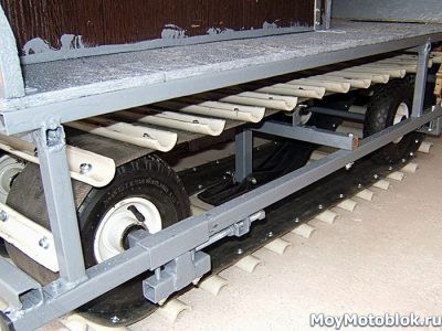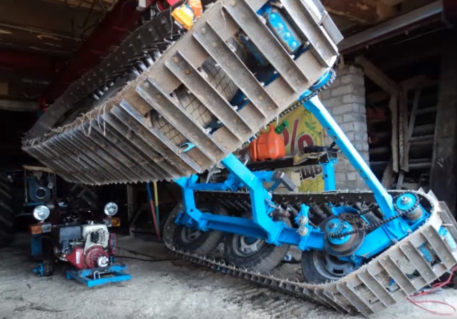 Гусеничный механизм, как правило, делается из мотошин, цепей, труб, ремней либо же транспортной ленты в комбинации с втулко-роликовой цепочкой.