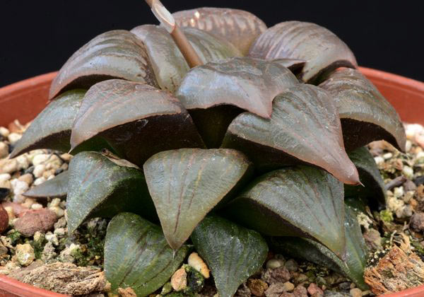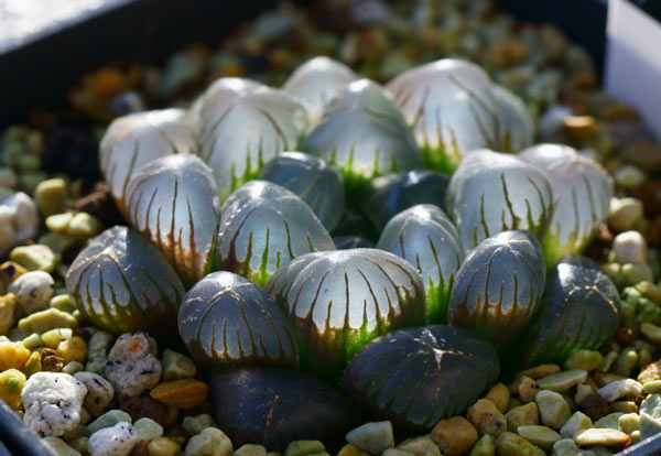 Хавортия Атрофуска (H. atrofusca) — листья сорта изначально имеют красноватый оттенок, а под воздействием солнечных лучей превращаются в полупрозрачные кристаллы.