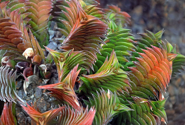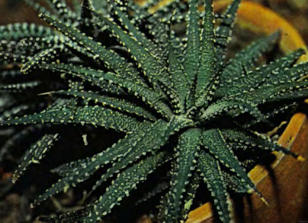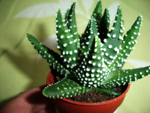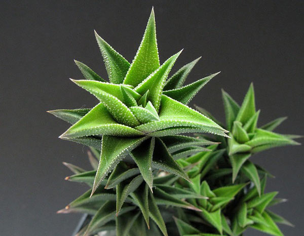 Хавортия извилистая — имеет мелкую выпуклую снизу листву тёмно-зелёного оттенка, покрытую пупырышками.