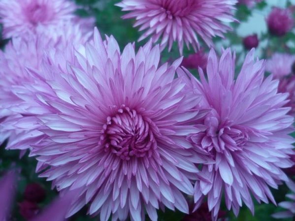 «Липстик» — насыщенный глубокий красный цвет, «Умка» — белая хризантема, «Сиреневая» соответствует названию.